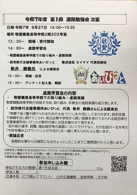 27日は進路勉強会を行いました。就労移行支援事業所あいびっとの代表をお招きしてお話をしていただきました。就労移行支援事業所に見学へ行くことはありますが、学校に代表の方が来てくださることはなかなかないため、参加を希望した生徒や保護者が参加してくださいました。就職がゴールではなく、就職後も笑顔で働き続けるための土台作りのためには高校生の内に何をしておけばいいか、大切なことは何かなどお話をしていただきました。どうしても就職をゴールと思いがちですが自分に合った環境や職種を見極めて働き続ける事が出来るかということが大切です。今後も時間がある時に進路勉強会を行う予定なので今回参加できなかった方は次回以降参加していただけたらと思います。進路勉強会時でなくても進路について気になることや質問がある場合は職員もサポートしていきますので、お気軽にご相談してくれたらと思います。